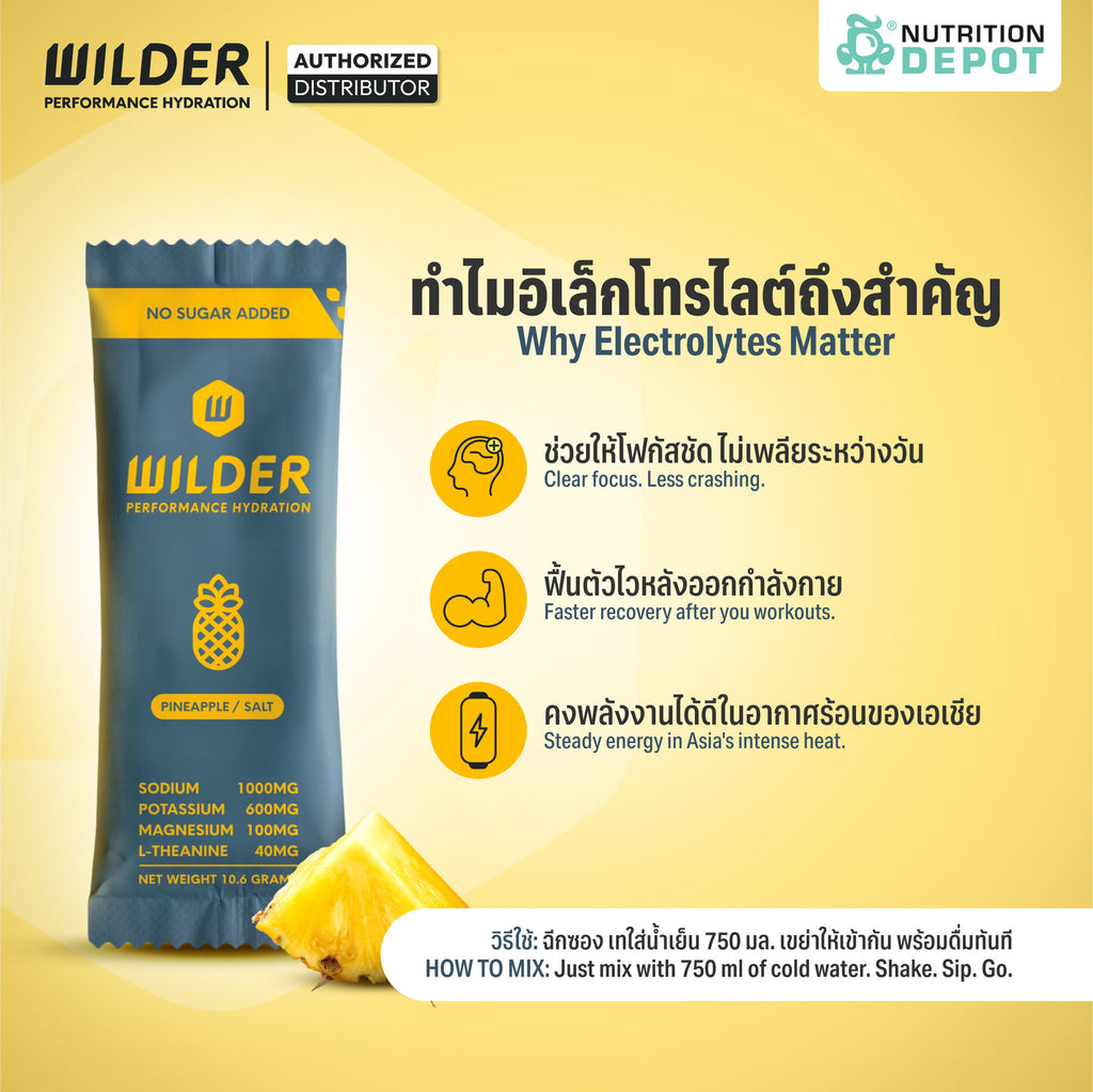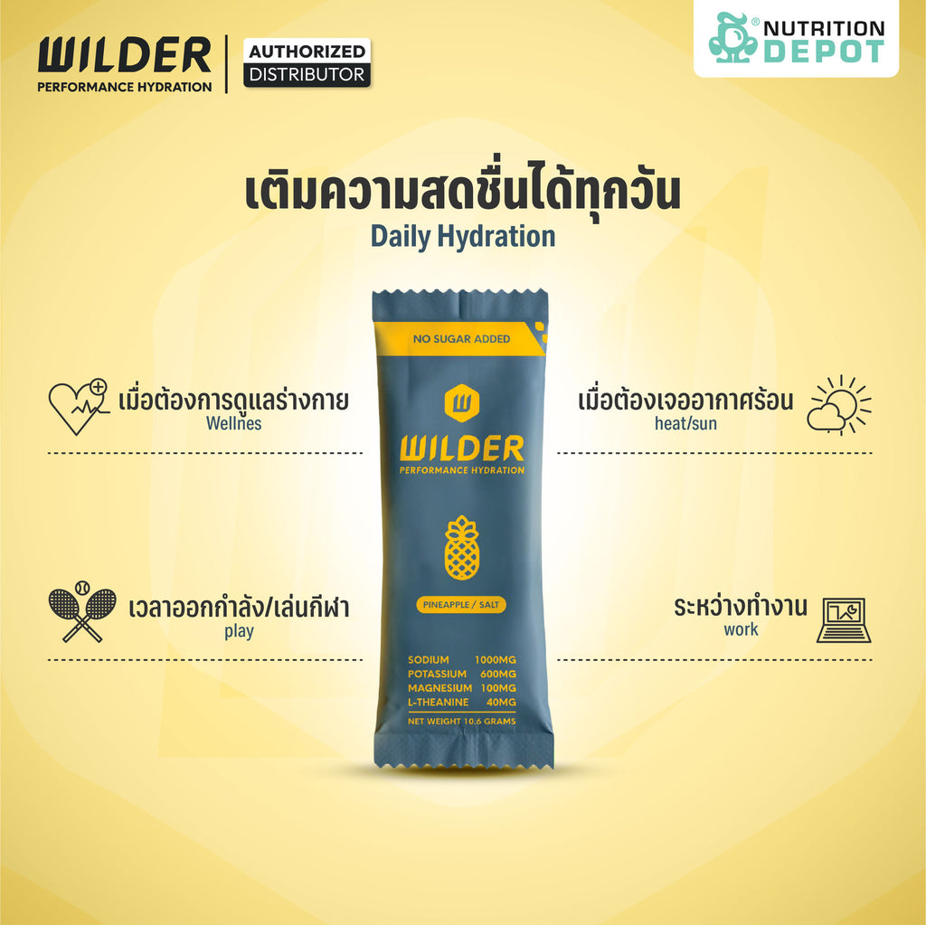ไวล์เดอร์เครื่องดื่มเกลือแร่แบบผง ปราศจากน้ำตาล,สี,กลิ่น,รสสังเคราะห์และคาเฟอีน ช่วยเติมความสดชื่น ฟื้นฟูร่างกายและเสริมสมรรถภาพระหว่างออกกำลังกาย ดื่มได้เป็นประจำทุกวัน ไม่ว่าจะออกกำลังกาย วิ่ง เข้ายิม หรือใช้ดับกระหายหลังทำกิจกรรมกลางแจ้งในวันที่อากาศร้อนจัด ช่วยปรับสมดุลแร่ธาตุในร่างกาย ลดความอ่อนล้าและเติมความสดชื่นให้ร่างกายกลับมามีแรงพร้อมลุยต่อ
